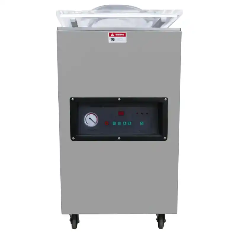 • Empacadora al vacío de pie con cámara interna y doble línea de sellado de 400 × 10 mm.