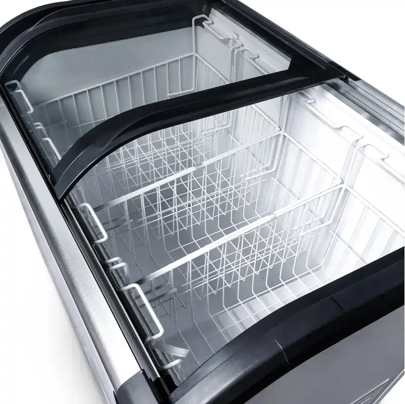 Ideal para negocios de alimentos, supermercados o restaurantes, esta congeladora ofrece excelente visibilidad con vidrio curvo, iluminación LED y control digital de temperatura para un almacenamiento óptimo.