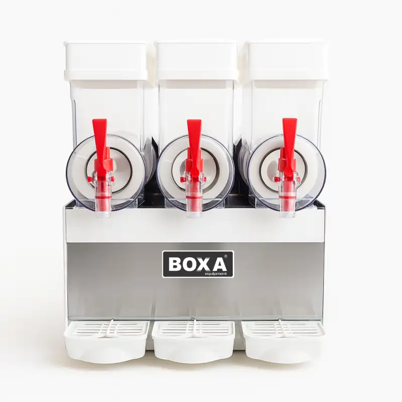 La cremoladera triple BOXA CR-12X3B es una máquina profesional de bebidas frías diseñada para locales del rubro HORECA que buscan eficiencia, durabilidad y alto rendimiento. Con tres tolvas de 12 litros fabricadas en policarbonato resistente y un cuerpo de acero inoxidable, garantiza higiene, resistencia y una excelente presentación del producto. Su sistema de enfriamiento con gas R134A mantiene una temperatura ideal de 7°C a 12°C, perfecta para preparar cremoladas, jugos o bebidas heladas. Es la solución ideal para quienes buscan una cremoladera triple BOXA que combine potencia, ahorro energético y una larga vida útil.