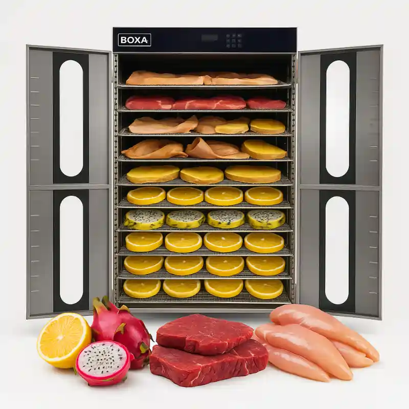 frutas y carnes deshidratadas en bandejas de deshidratadora industrial BOXA